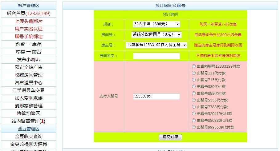 5.根据自己的需要选择房间规格等各项,输入房间名称,如果是有他人代付,可在红色区域指定特定的聊号作为代付人,完成后点击“提交订单”进行下单操作。